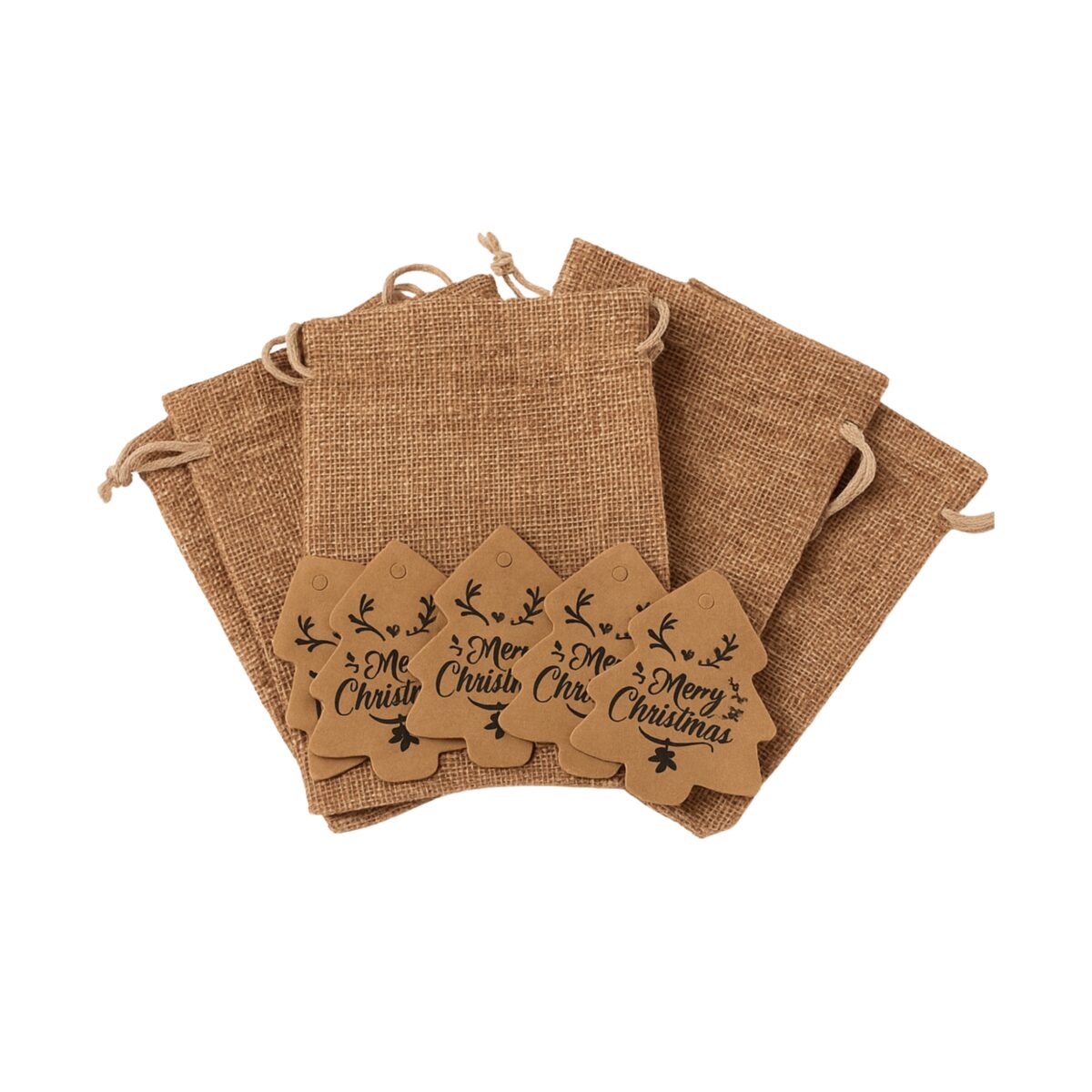 Woreczki jutowe + zawieszki choinki Merry Christmas