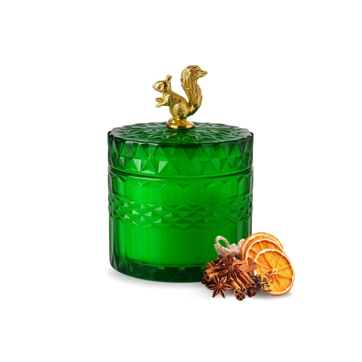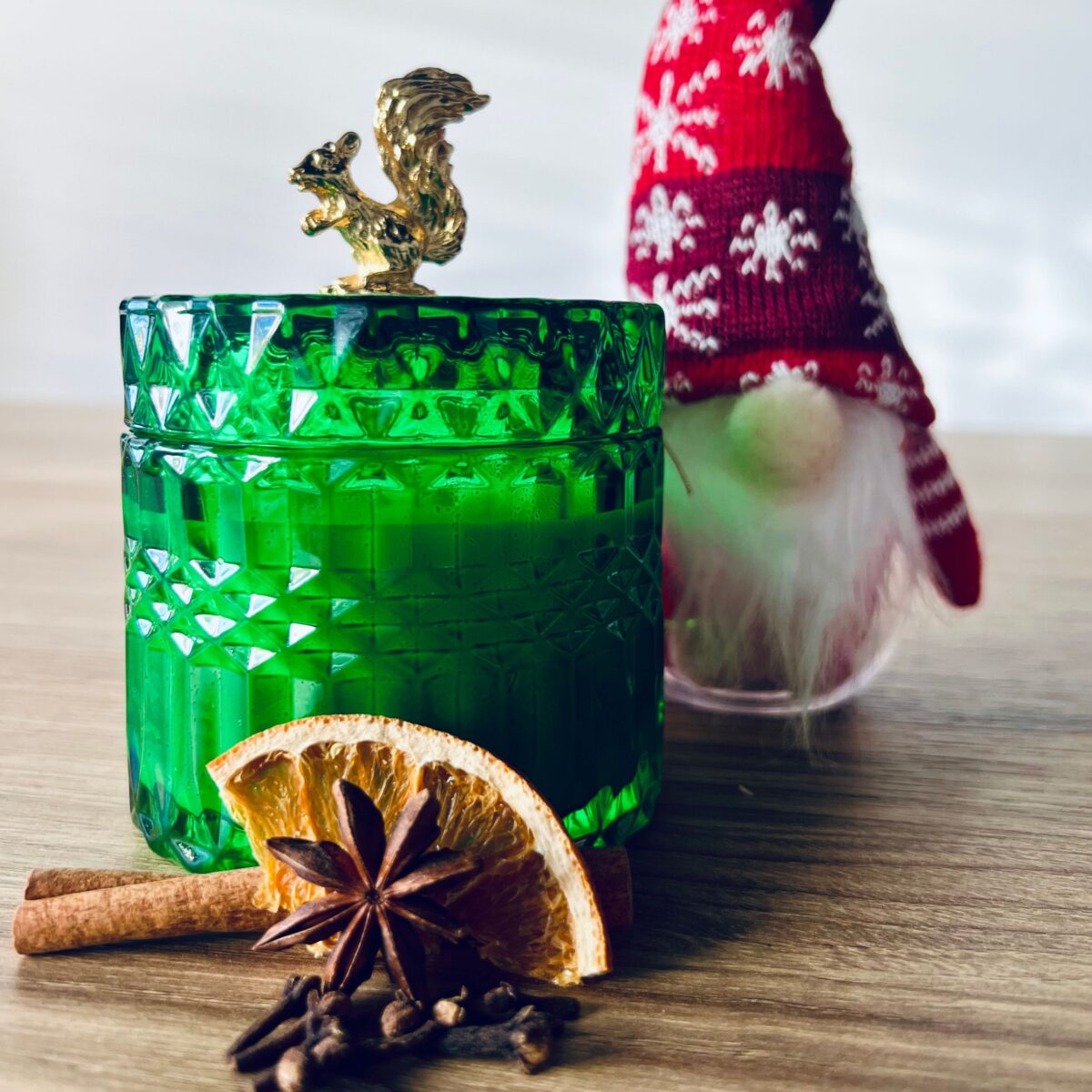 Elegancka świeca sojowa w szlachetnym zielonym szkle, zamknięta złotym deklem z figurką wiewiórki – idealna jako prezent świąteczny, dekoracja salonu lub dodatek do zimowego relaksu.