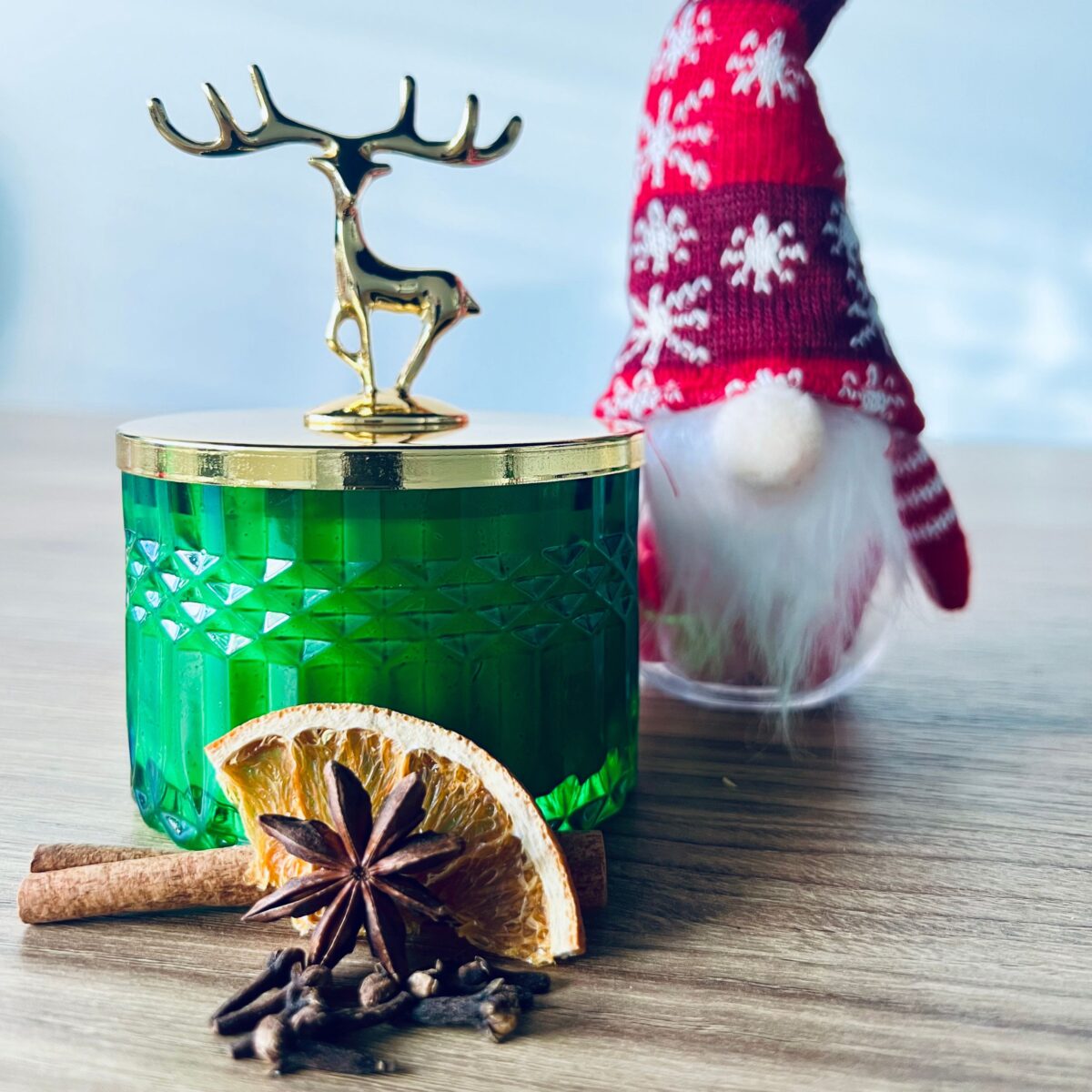 Elegancka świeca sojowa w szlachetnym zielonym szkle, zamknięta złotym deklem z figurką renifera – idealna jako prezent świąteczny, dekoracja salonu lub dodatek do zimowego relaksu.