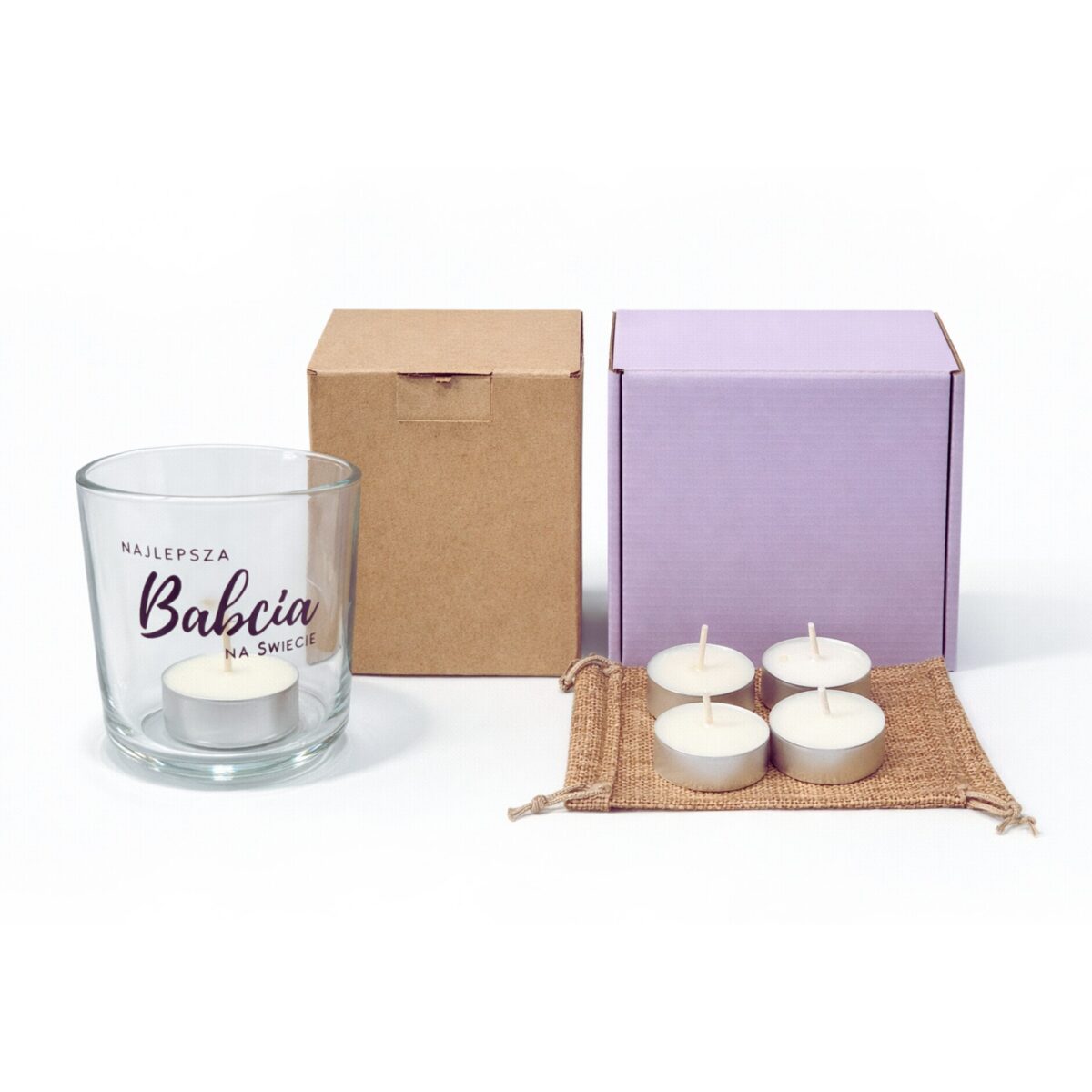 Zestaw prezentowy z grawerowanym szkłem z dedykowanym napisem dla Babci, przeznaczonym do bezpiecznego użytkowania z tealightami. Szklana forma skutecznie chroni przed otwartym ogniem, jednocześnie tworząc efektowne, rozproszone światło, które podkreśla grawerowany napis.
