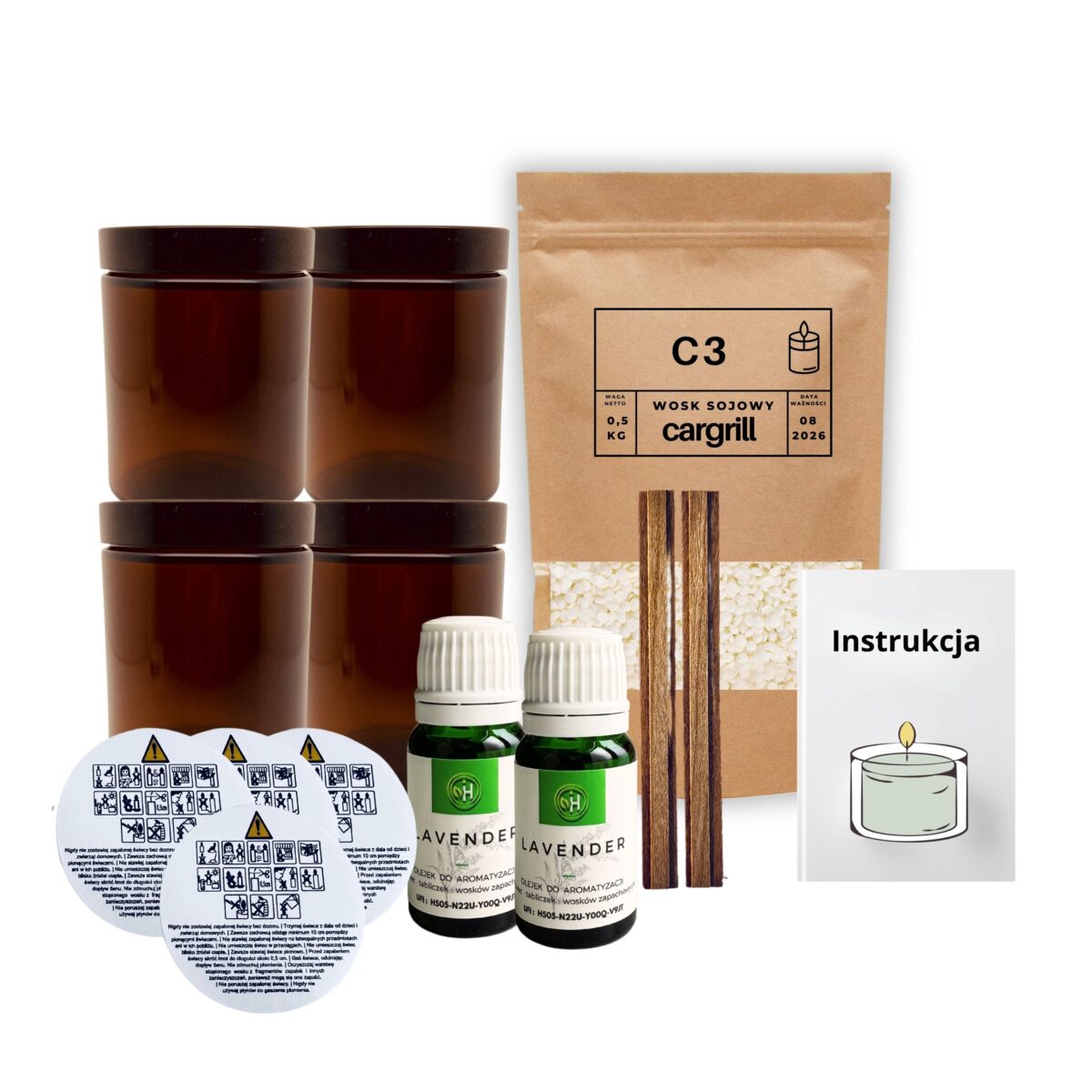 Wosk sojowy C3 zapewnia czyste spalanie oraz dobre oddawanie zapachu. Brązowe szkło skutecznie chroni świecę przed światłem, stabilizuje proces palenia i nadaje gotowej świecy estetyczny, neutralny wygląd. Zestaw jest wykorzystywany przez nas podczas warsztatów i zajęć kreatywnych – rozwiązanie sprawdzone w praktyce.